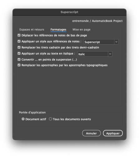 SuperScript is an InDesign script designed to automate typographic corrections in layout documents. It precisely applies the rules of French typography — space management, punctuation correction, quotation mark handling, apostrophe replacement, removal of double line breaks, and more — while respecting editorial nuances. The script also handles footnotes intelligently: it moves footnote references before punctuation and automatically applies a defined style, avoiding common mistakes and tedious manual edits.